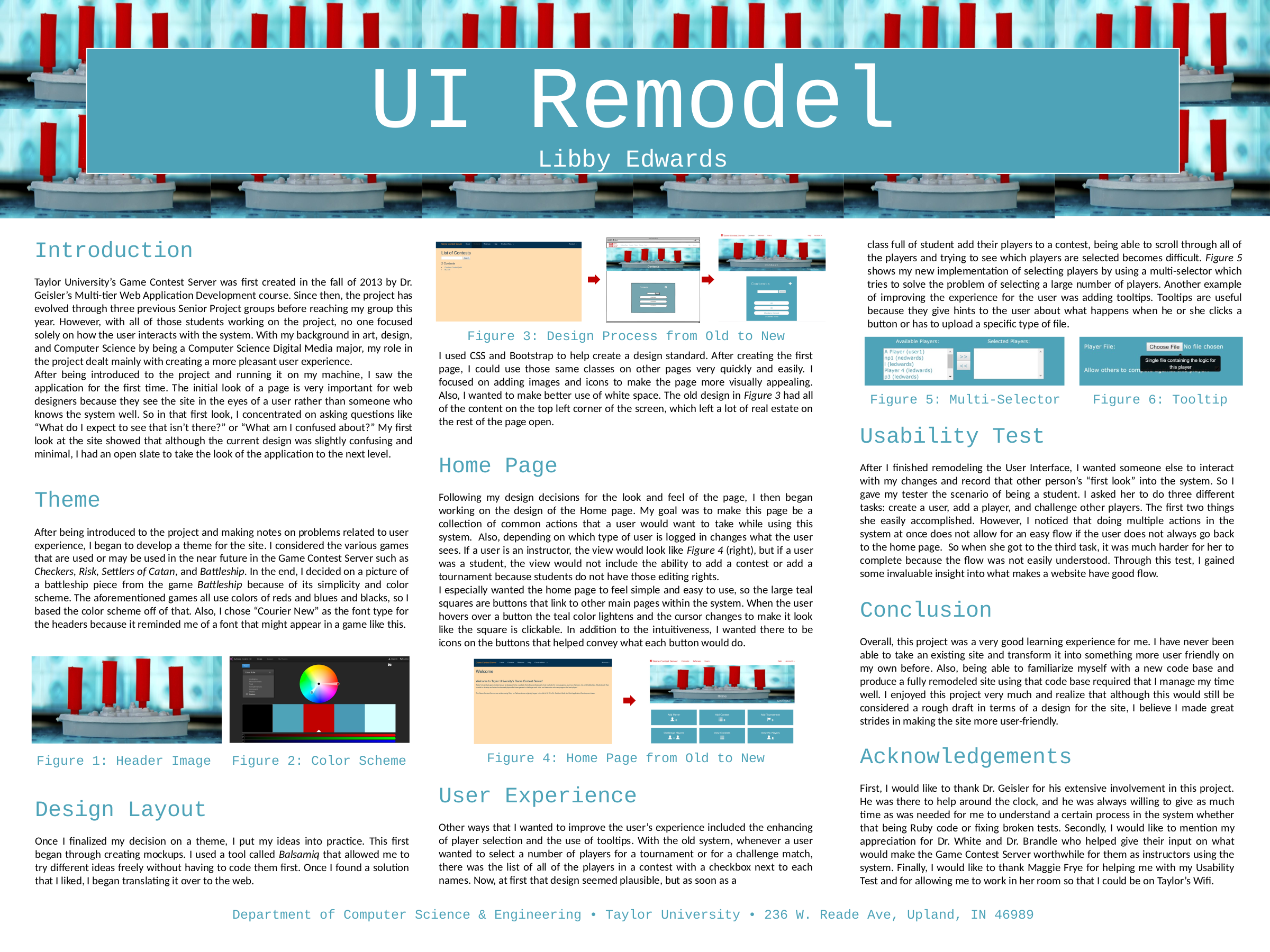 Libby took on the challenge of giving Taylor's developing Game Contest Server a complete overhaul in terms of visual appearance and user experience. She took the webpage from left-aligned text blocks on solid-colored backgrounds to a user-friendly experience with a cohesive color scheme.