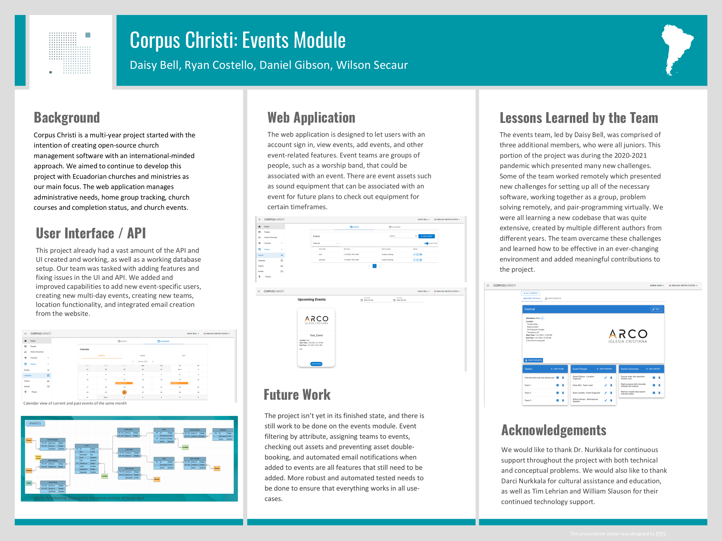 A team of one Senior and three Juniors, this group added features and fixed issues in the User Interface and API of the Corpus Christi web app, a multi-year project designed to offer Church management abilities, with a special focus on international use.