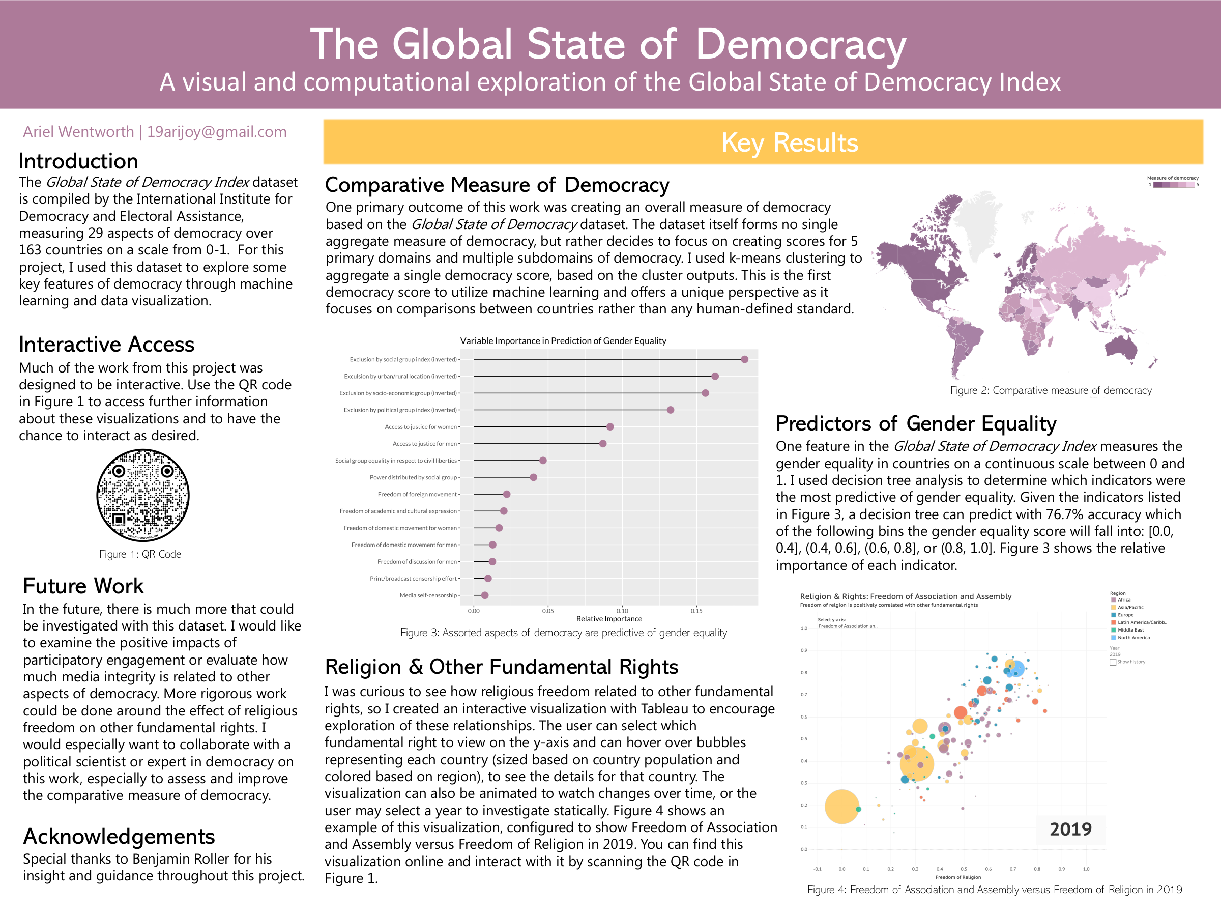 Ariel used her statistical and computational knowledge to gather, interpret, and display measures of and contributors to democracy, gender equality, and fundamental rights around the globe. Her project culminated in a series of interactive visualizations, available online.