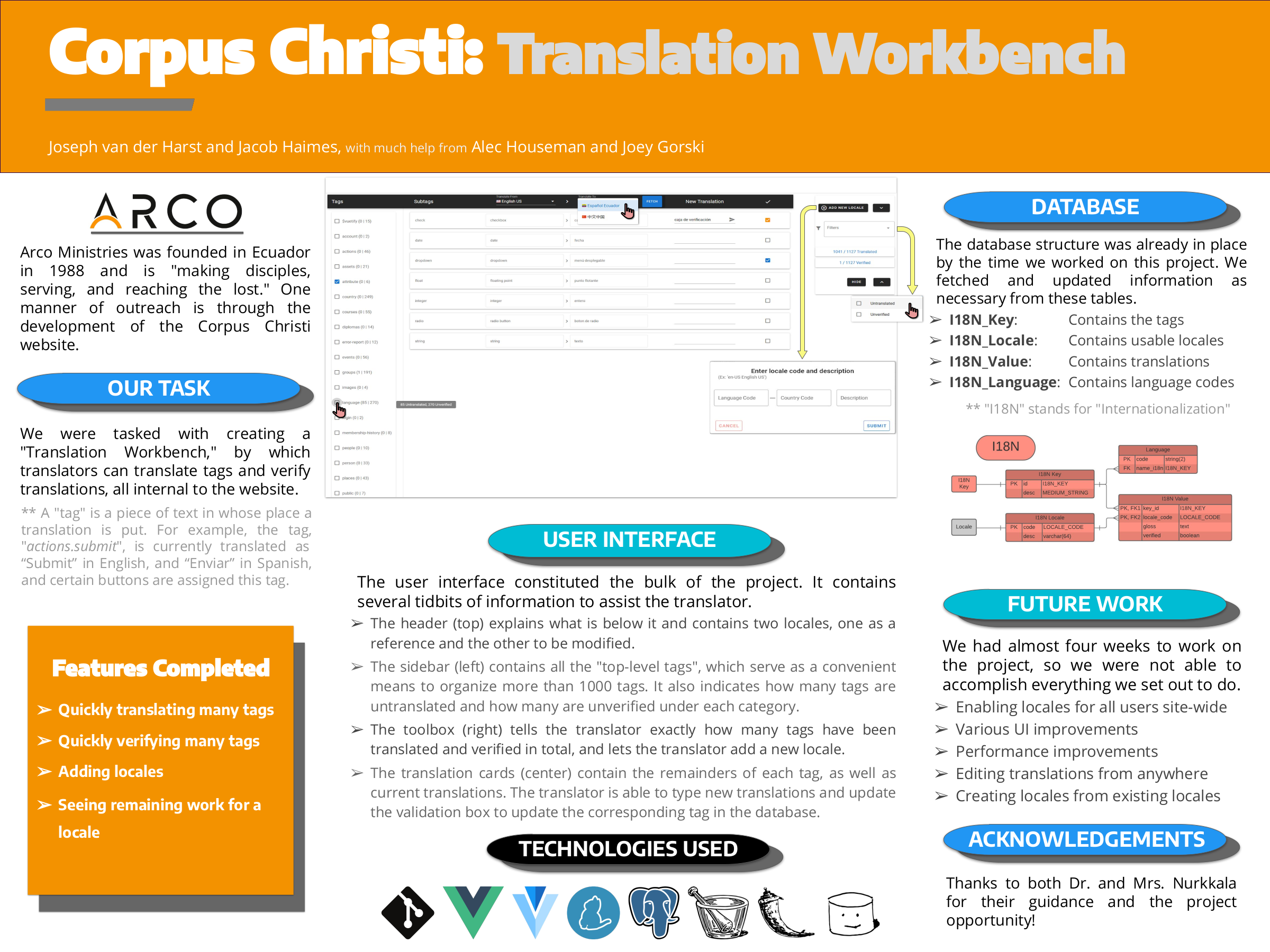 Yet another branch of the Corpus Christi application, this group worked on impementing a "Translation Workbench", which enables translators and native speakers of various languages to categorize and improve multilingual information relevant to churches' ministries across the globe.